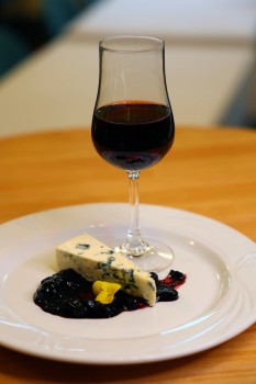 Lasillinen 8cl Ruby Portviiniä, pala sinihomejuustoa ja hilloa. Laktoositon.