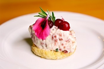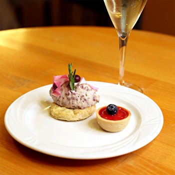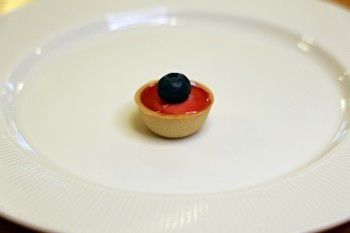 Lasillinen Talon kuohuviiniä, saaristolaisnappi savuporomoussella sekä Petit Fours metsämarjatartaletti. Laktoositon.