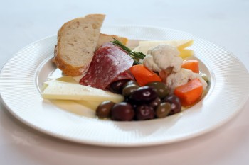 Manchego, sinihomejuusto, salami, pikkelöidyt kasvikset, oliivit, leipää. Laktoositon.